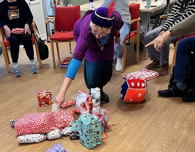 Op 5 December hadden we de groepsruimte tot een mooie cirkel van stoelen omgetoverd. Toen de cliënten binnen kwamen, werd de stapel pakjes in het midden steeds groter. Er was een ware staf van Sinterklaas, en die ging rond om iedereen zo even zijn of haar zegje te laten doen. We zorgden voor koffie en wat lekkers en toen kon het dobbelspel beginnen.